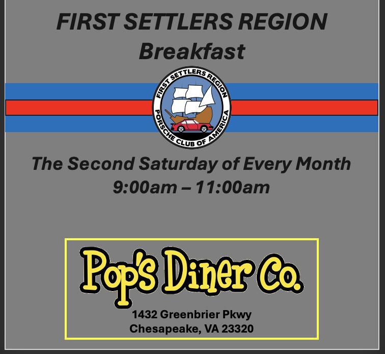 Please join us for our monthly breakfast in Chesapeake. Plan to arrive 30 minutes early to gather in the parking lot for Porsche talk!