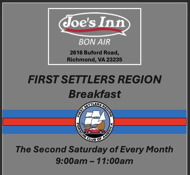 Richmond Breakfast- 2nd Saturday of each month- Time: 09:00 am - 11:00 am (arrival in parking lot ~30 minutes early to meet & greet other members)- Joe's Inn Bon Air (2616 Buford Rd, North Chesterfield, VA 23235)- No registration necessary - just show up!